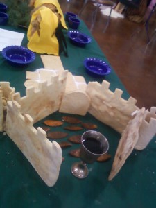 Once I had the lard done and the dough in the right consistency, a template for making walls and then towers had to be worked on. None of the research I had showed or mentioned how a circular form was built or how battlements were made. From what I can glean the actual square cut battlements could have been cut out by hand, free form. I didn’t want to trust my hand battlements to such guess work so I made a paper template from which to cut out the square portions at the top of the dough. For the actual towers, a sheet of paper was tied with string, then covered with foil, sprayed with oil then the battlement cut dough was wrapped around the form and cooked up right. In period, my guess for the towers would be that the head cook would have used either a round wooden form or metal tube, well greased. I did not have access to either so choose to use some thing more available that was potentially as period. Paper, string and oil were very much available though the foil would not have been, though this could be symbolized as a metal tube.