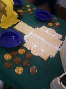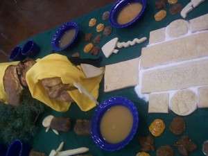 I first started with small items such as the making of yogurt from milk to make the cheese for the “glue” on the castle walls. Then to orange peels and candied fruit. The two type of cookies used were fairly easy to find though the springerle cookie recipes offered many different variations, the one used was the oldest recipe I could find. The springerle were then redacted with only a slight modification (peach schnapps instead of cherry schnapps). The short bread is just one of my favorite type of cookies so again after finding a period recipe, redaction was used to find the best flavor with the ingredients in the right proportion.