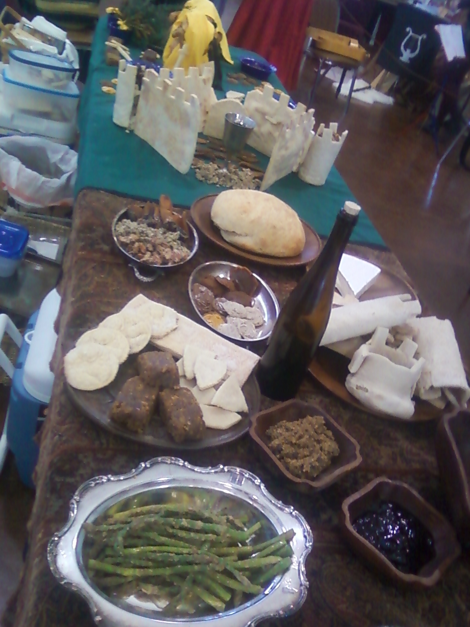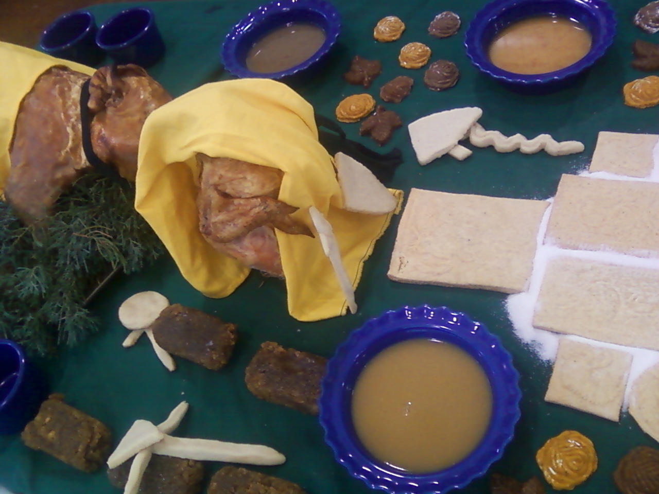 Many period feasts had sauces for the meats. I thought that using blue ceramic dishes with the period sauces would be great ways to display the sauce while making a reference to the “rain” that is ever present at Gulf Wars. I debated using rye flour “cups” however I found that the only reference to a rye dough was used for the baking of thick walled “coffins” for meat pies.