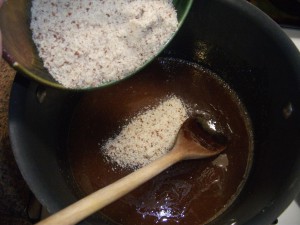 Once the honey sugar and oil were well mixed (I used a wooden spoon instead of a poker) I added the almonds into the mix with a little rosewater.