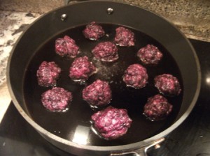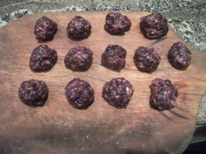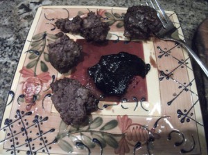 Now some people will say currents and raisons are the same. They really aren’t. Currents are much smaller and a bit sweeter; however if currents are out of your price range/feast budget go with raisins. You’ll be much happier that way. The first improvising was not the use of raisins in the recipe (though I did do that on the 2nd batch that was used in a Nobles Luncheon) I had to use a dark raspberry jam so that the sweet would permeate the meatballs.