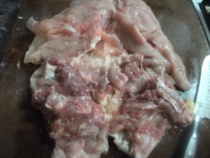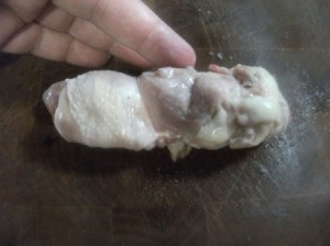 This is a deboned chicken. This looks like some thing from a horror show but really it’s the legs and breasts folded back and the bones removed.