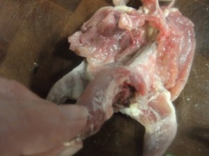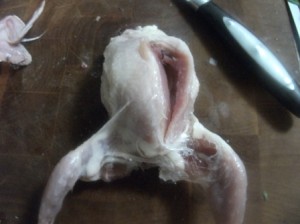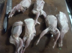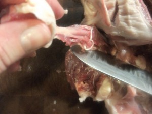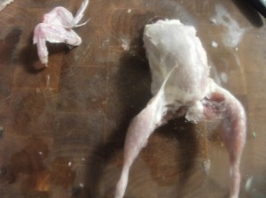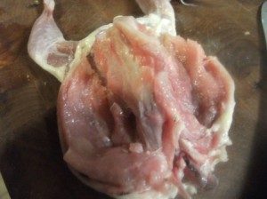This is not a pretty picture. If you’re squeamish you may want to ask a really really good friend to do this work. I would suggest bribing with chocolate or a good steak dinner. After deboning these, the friends may not want to see another bird for awhile even cooked birds!