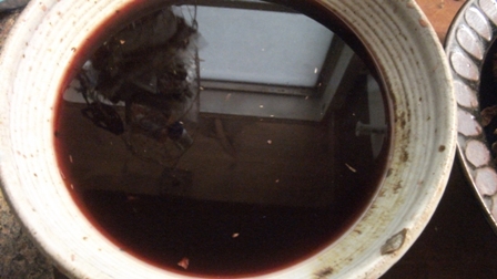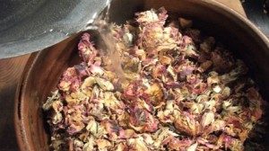 I didn’t want to use American rose petals but rose petals as close to period as possible. Hence the use of Pakistani dried roses. The 4 ozs of rose petals were place into a largish pottery bowl.
