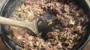 This rose water is NOT like the rose water found in the stores today. This is actually the color of the roses not clear for starters. This rose water is milder, much milder, then bottles we buy today. Today’s rose water is so strong that only a cap full at a time can be used, if that, so that a dish is not over powered with the scent and taste of roses. The home made rose water is a) closer to period and b) far less pervasive then today’s so more can be used.