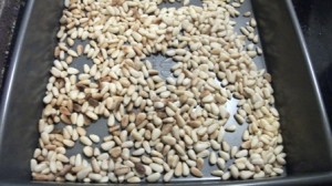 And the roasted pine nuts. Pine nuts roast a lot faster then walnuts or hazelnuts, so keep an close aye on them! Pine nuts are waaaay to expensive and tasty to waste burning.