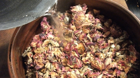 First I boiled 5 cups of water, then poured this over the 3 cups of rose petals (roughly 2 – 3 oz).