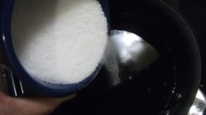 The rose scented/flavored water returned is roughly 4 cups. This was then placed into a pot, to which I added 6 cups of sugar.