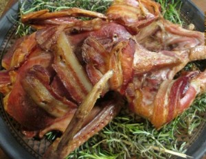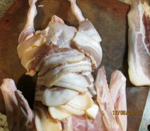 Once the bird had been redressed in a pork covering, it was roasted for an hour or more, until done.