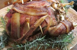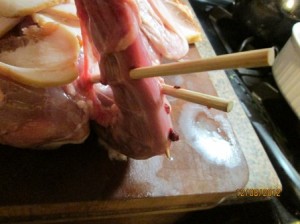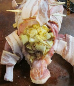 The duck after being stuffed was wrapped in bacon slices. I had to affix the bacon with skewers. Toothpicks would have worked; however I was out of those.