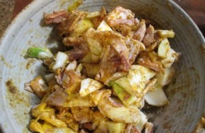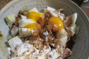Everything was mixed together as evenly as possible coating the fennel and bacon with the finer spices and egg yolk.