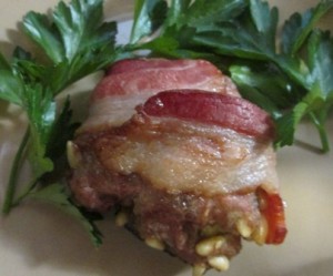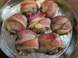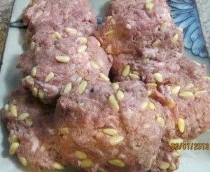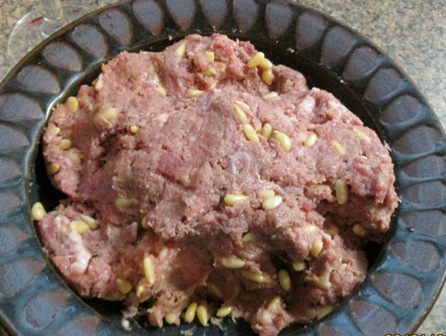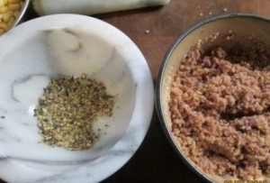 “Grind chopped meat with the center of fine white bread that has been soaked in wine. Grind together pepper, garum and pitted myrtle berries if desired. Form small patties, putting in pine nuts and pepper. Wrap in omentum and cook slowly in caroenum.” (Giacosa, pp. 90)