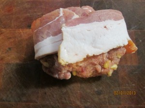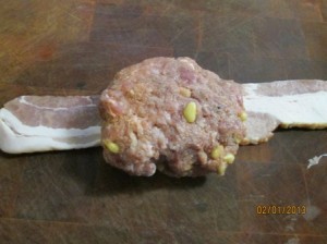 Next cover with the bacon. You shouldn’t need a tooth pick. The bacon grips pretty well to it’s self.