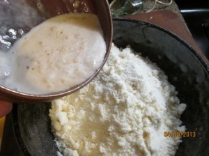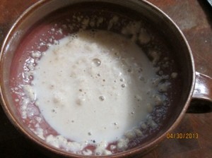 Take about a teaspoon of sugar and add to the yeast. This will get the yeast going while you mix the other ingredients together.