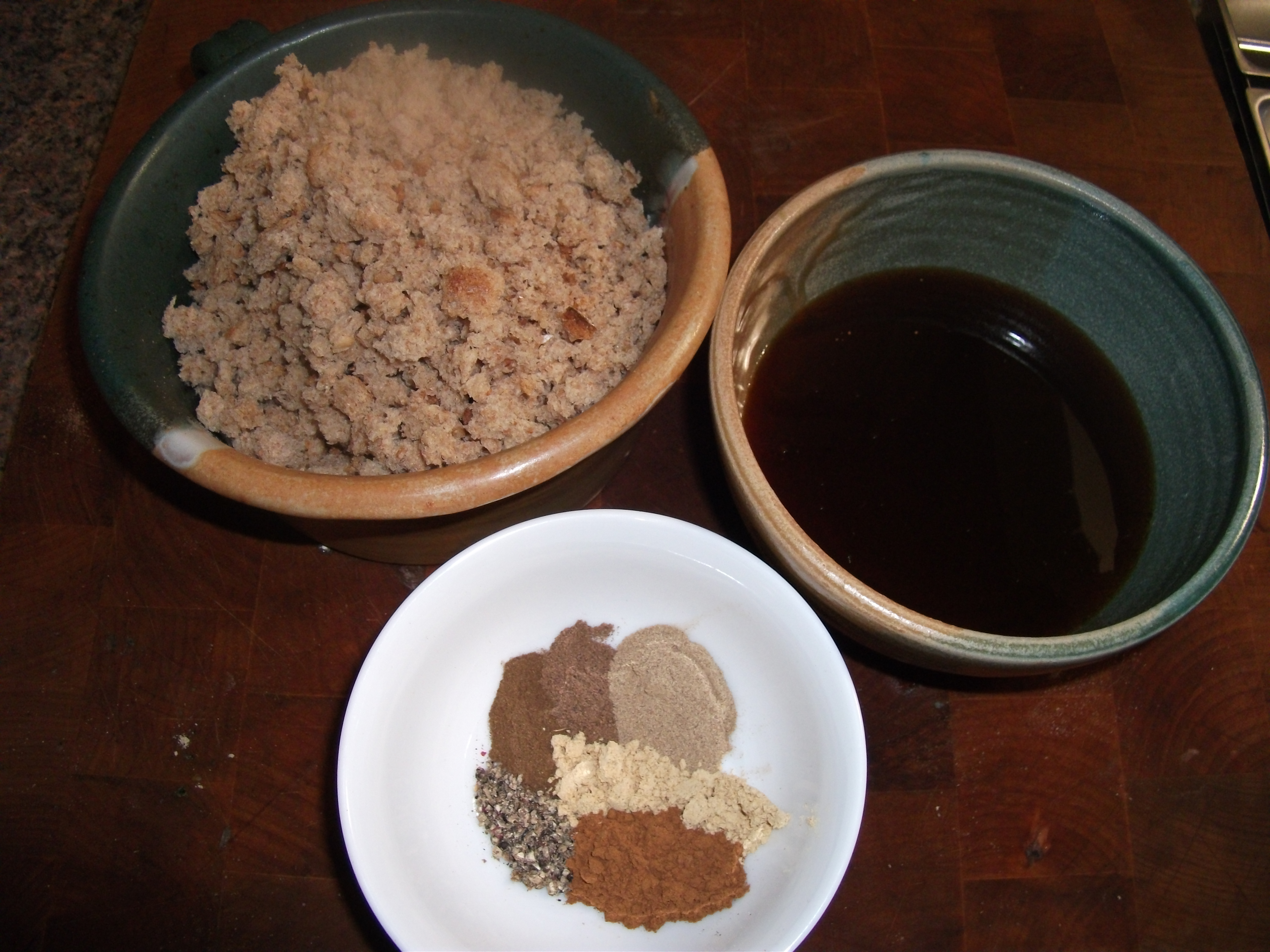 If you will notice the bread crumbs are from a whole wheat bread I had. In period if this dish were to be served to nobility or royalty the probability that the bread was made from good white flour with out a lot of whole wheat is much higher then a whole wheat or grain based bread. I would suggest a good bread made from white flour, water, either ale or water , and the yeast can actually be the must from the bottom of the ale barrel or ale yeast if you wanted a more purist type of bread. (That will be in another post later.)
