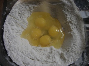Next I made a well in the center of the dry ingredients and added the eggs and the schnapps.