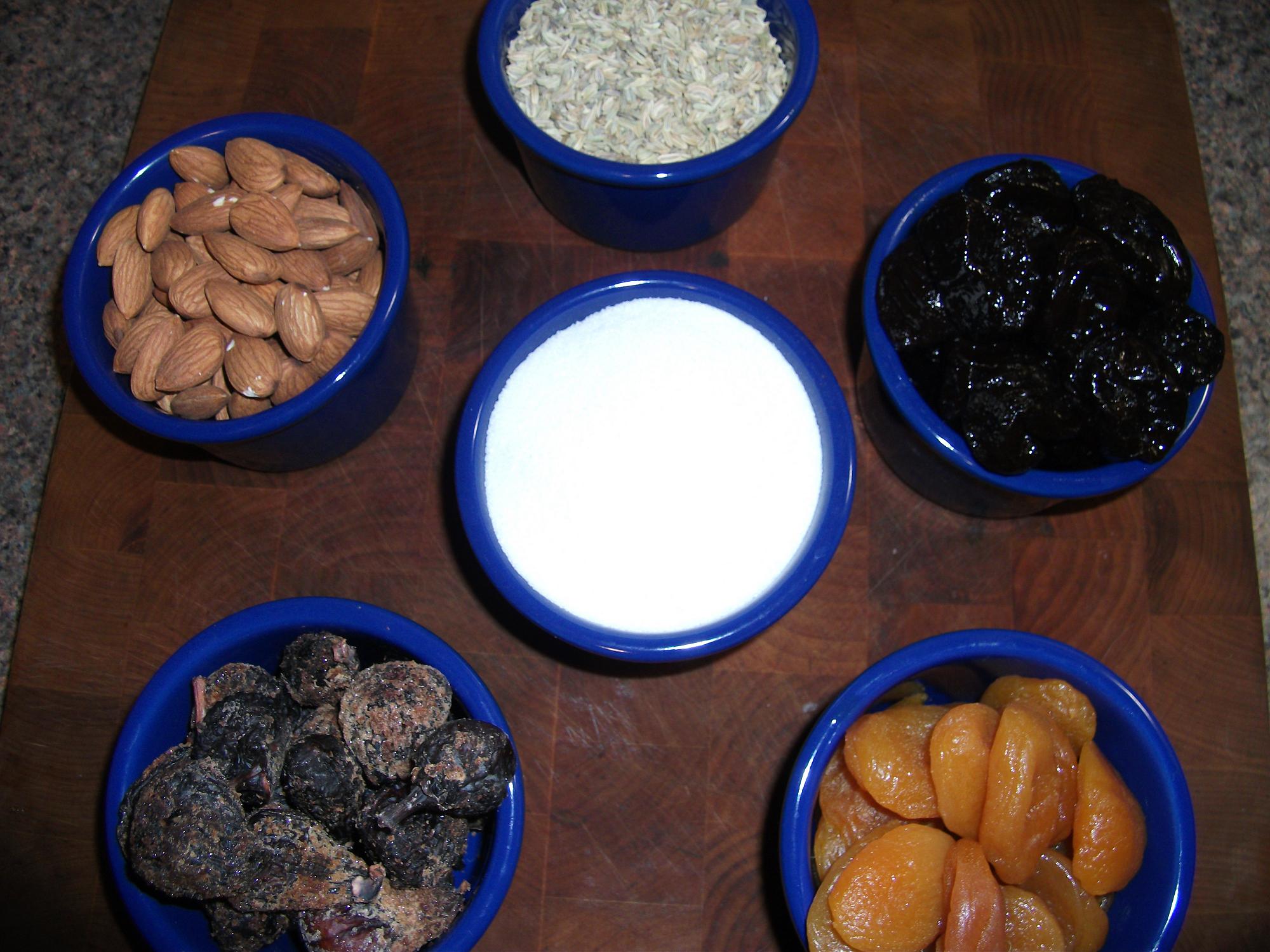 I wanted to try this with dried fruits and nuts as seeds are very very tiny and take copious amounts of time. I choice apricots, plums, and figs as these were all available in period and very tasty. I also did a round of fennel seeds just to see what would happen.