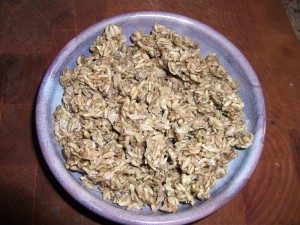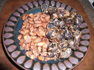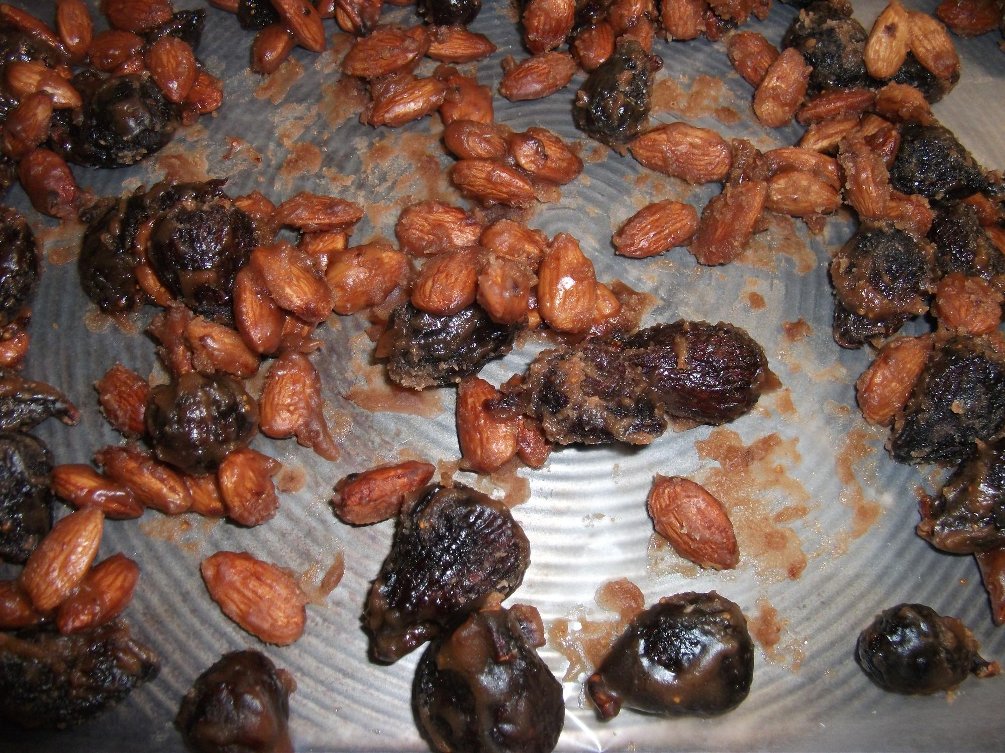 Once the mixture had complete cooled, I heated up the pot with the items again. I did this 5 times. The 5th time I heated up the sugar water mixture most of the water had evaporated turning the sugar into a coating that clung to the fruit and nuts.