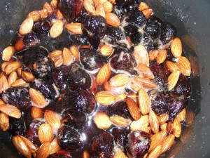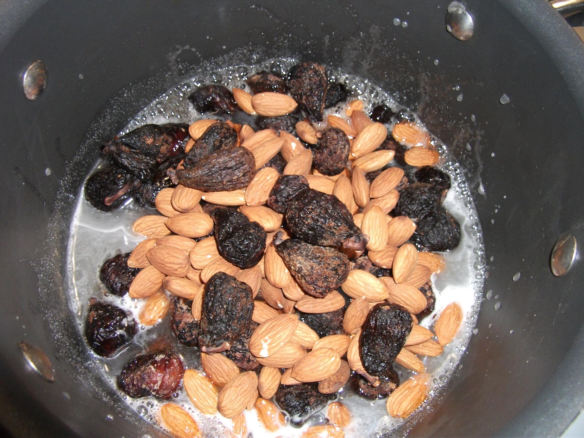 Once the sugar water started to boil I added the almonds and figs.