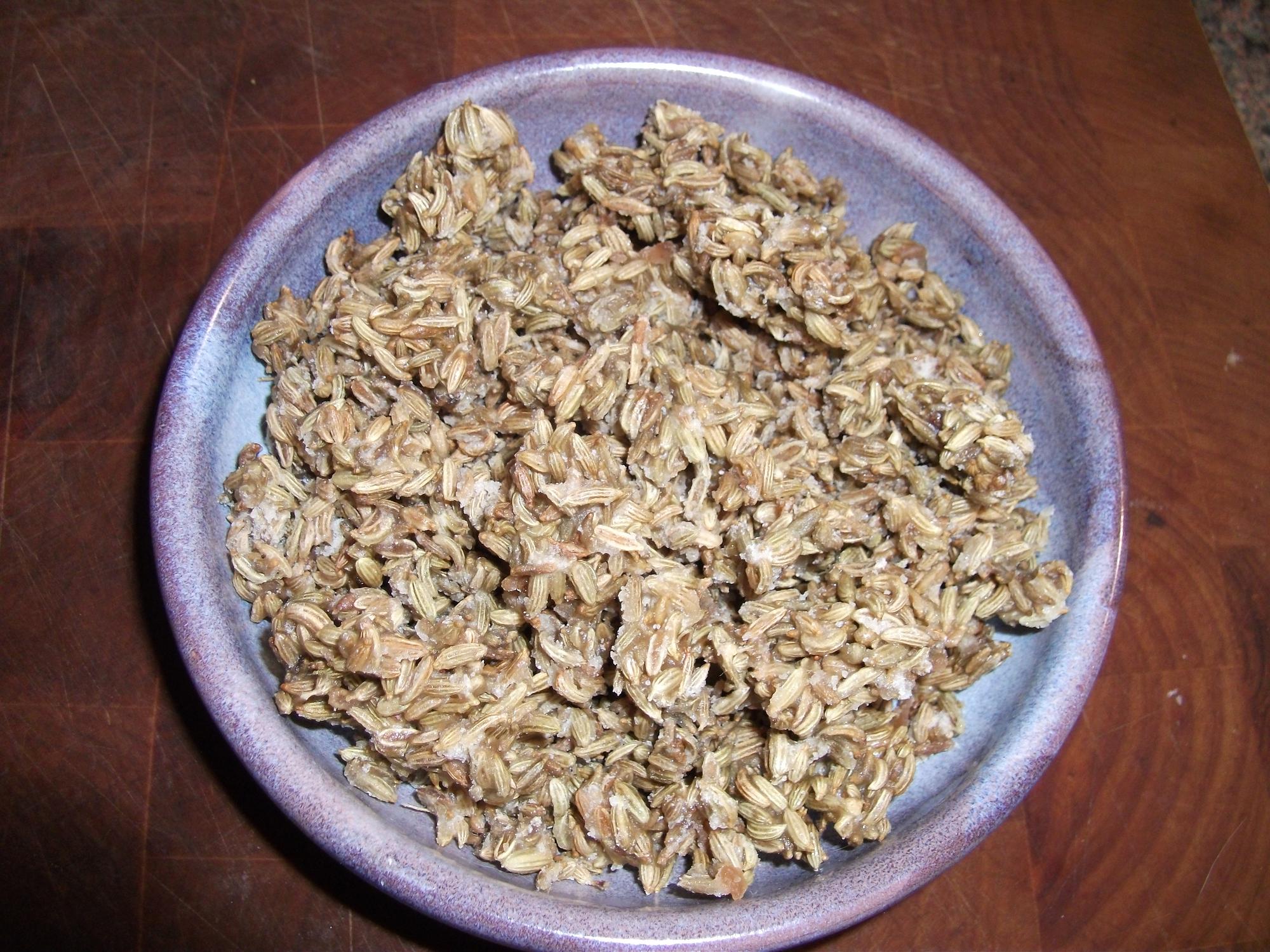 Combine sugar and water in a heavy pan for 5 minutes, add seeds and stir until the syrup begins to look white; set aside for 10 minutes. Then put back over low heat, preferably over a protective mat or heat diffuser, and stir until the sugar coating softens enough to be poured. Pour onto a cookie sheet or a piece of clean screening over a cake rack. Spread the seeds out with a paring knife separate them as much as possible; as they harden…