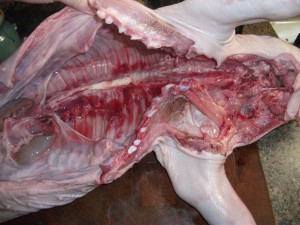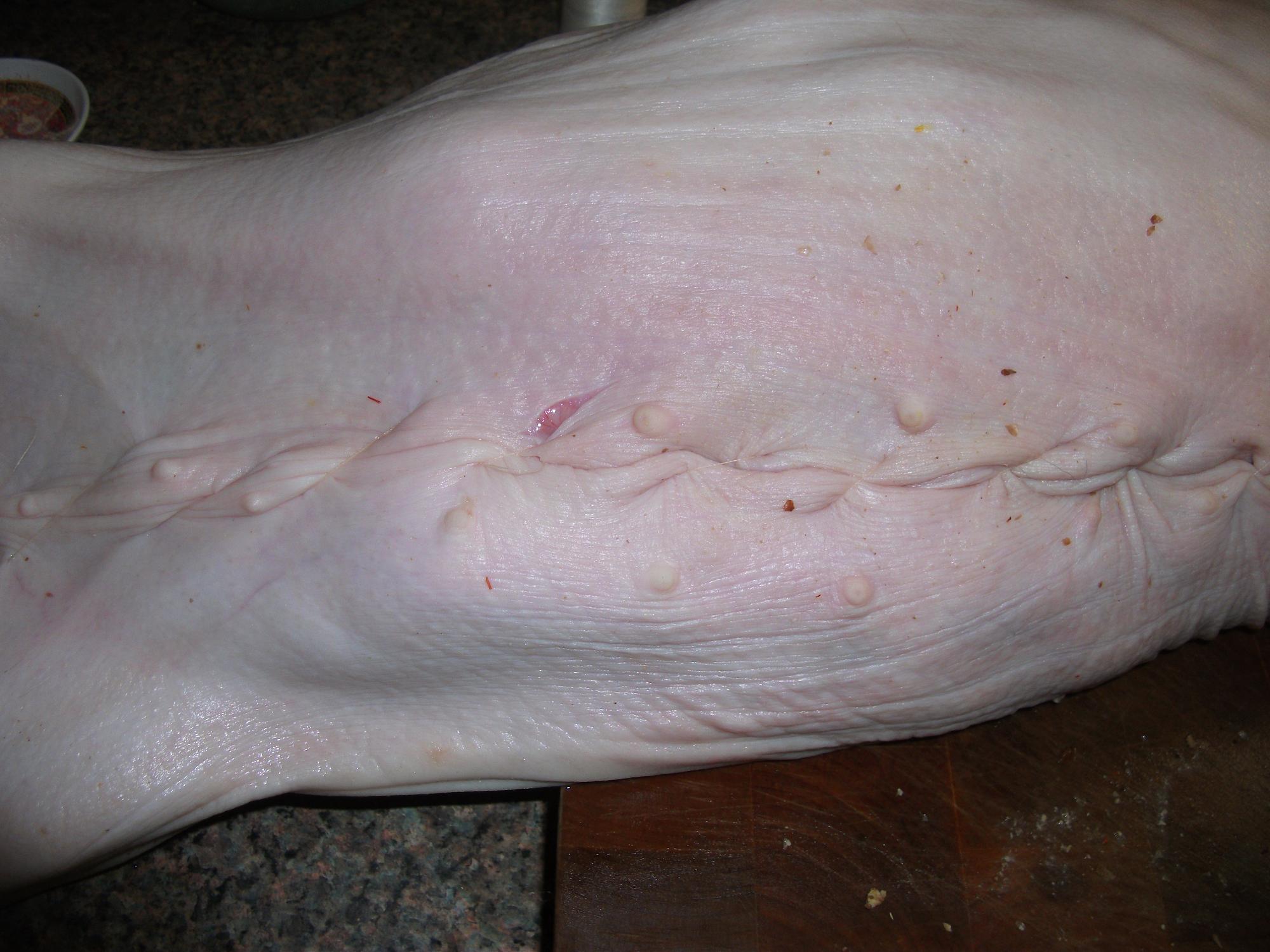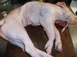 When I started this project, I had no idea how hard it was to find piglets. They are as rare and as hard to find as peacocks! I actually had to contract a slaughter house for the piglets so the actual slaughter and saving of internal organs was not available. This precludes the ability to pull the offal out through one small slit in the stomach and then refill with the stuffing through that one small slit. So with that in mind I have edited this recipe for a more modern consumer of purchased piglets.