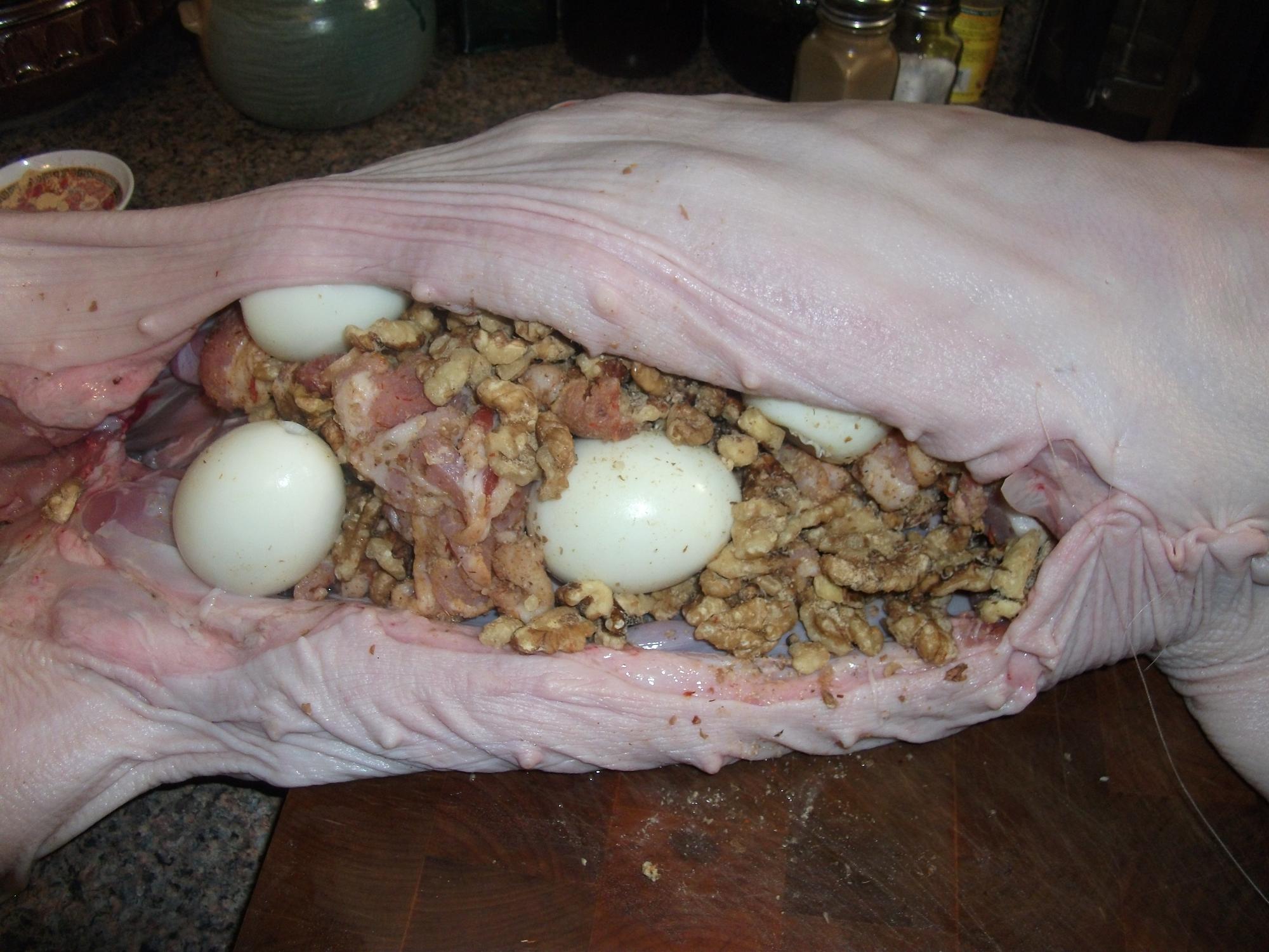 9-14 lb piglet 1 lb bacon 4 C walnuts 7 cooked eggs