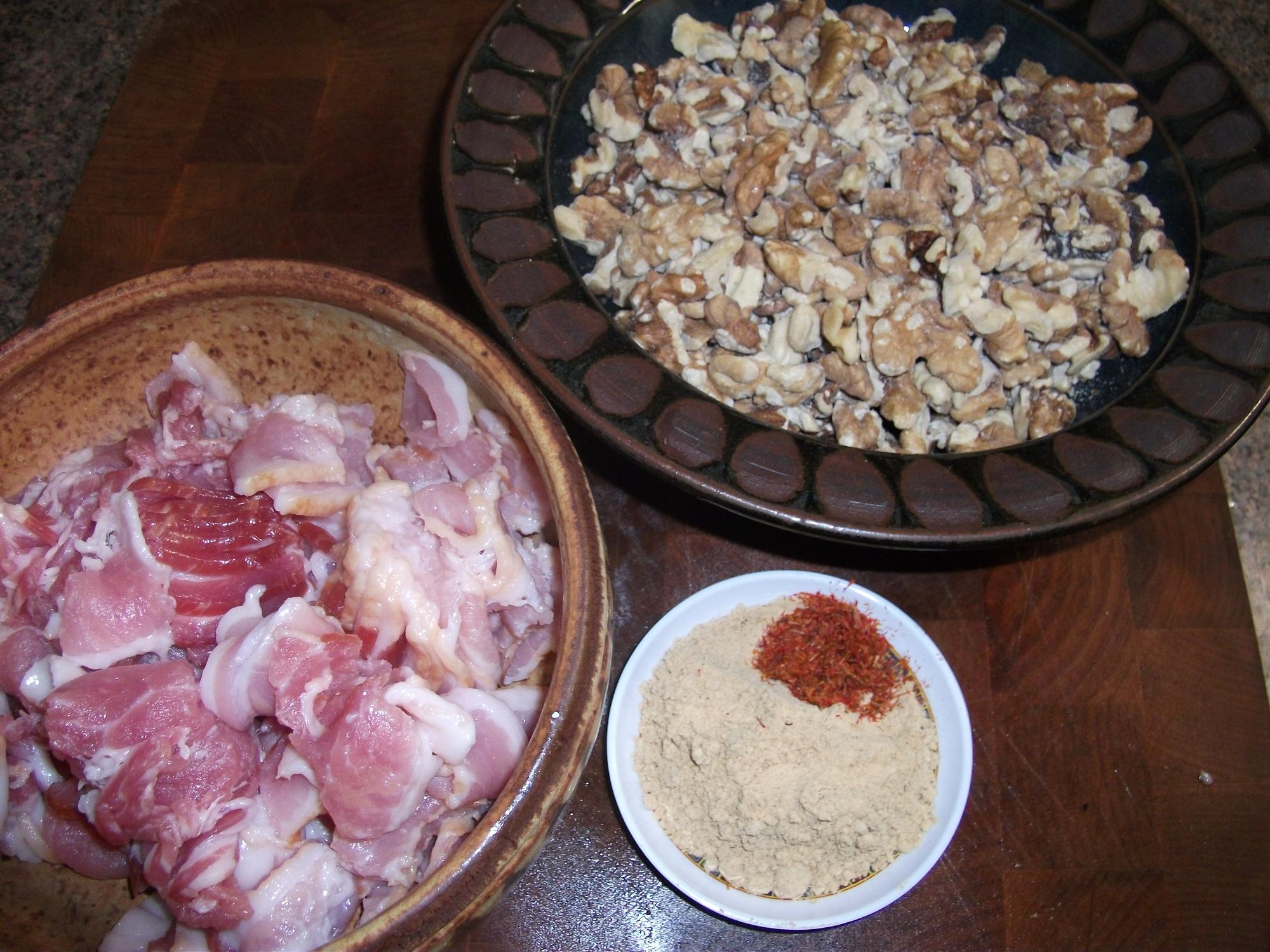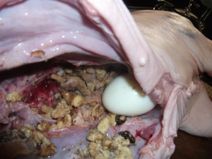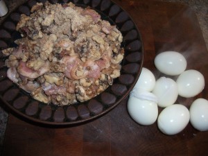 I had forgotten to get a picture of the eggs mixed with the stuffing (they were boiling while I compiled the walnuts, bacon, ginger and saffron together. Here they are next to the rest of the stuffing and ready to be inserted.
