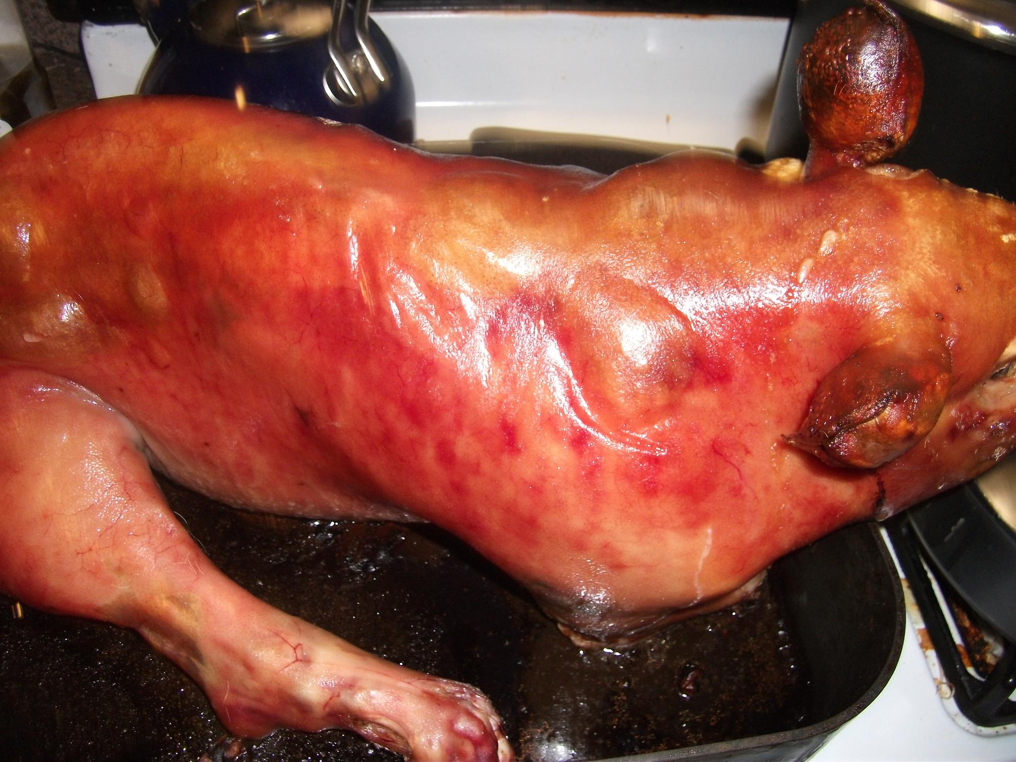 Here is where you can see where the piglet’s head actually hung over the roasting pan. The snout was with in centimeters of the oven wall. The ears not being wrapped in either foil or “linen bandages” puffed up like air bladders. Rather cute.